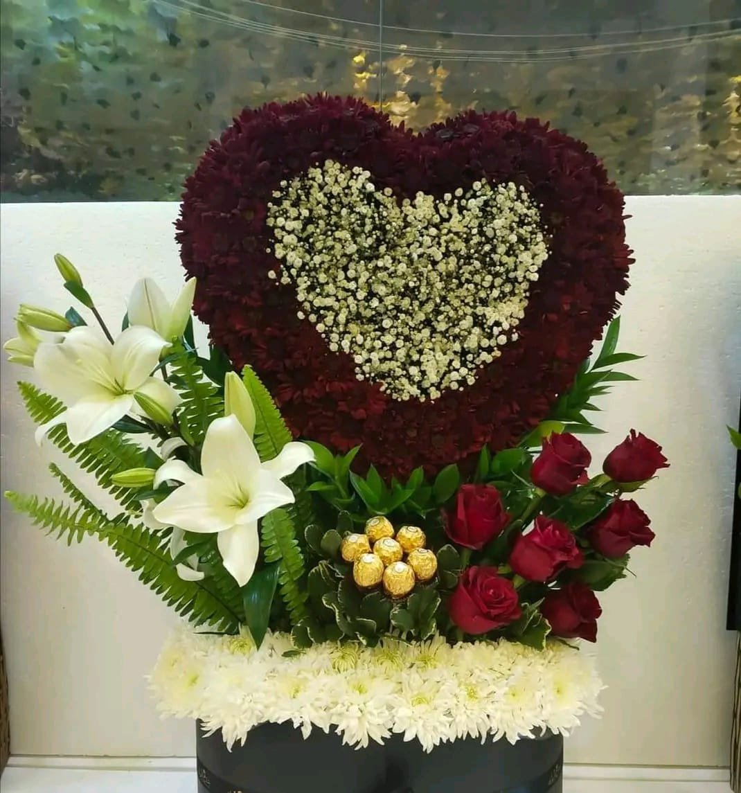 بوكس به قلب بورد كرازنتم احمر وبيبي فلاور ومعه ليليم وشوكولا فيريرو روشيه