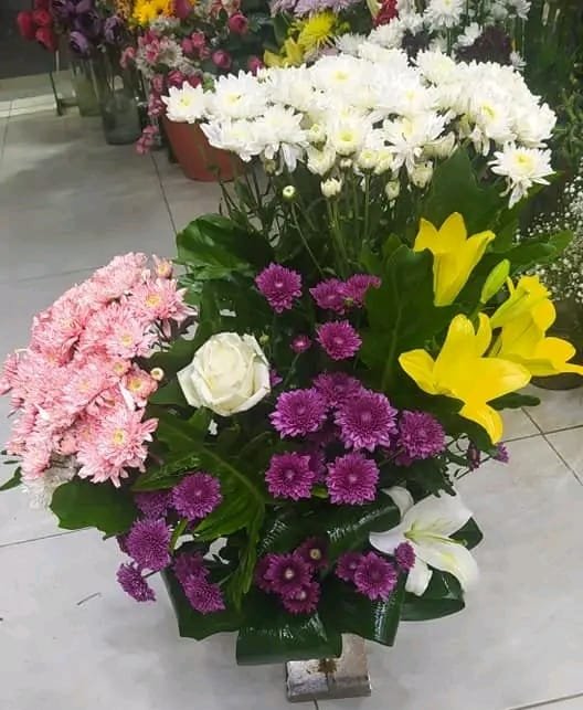 بوكيه استاند كرازنتم ابيض وبينك وموف وتوليب اصفر