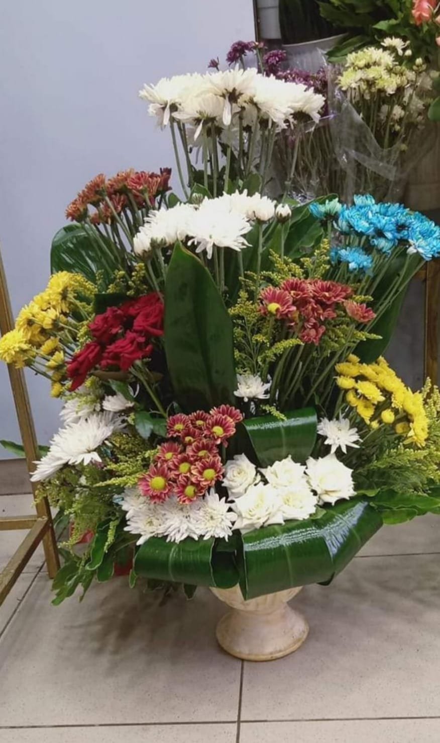 بوكيه استاند مكون من ورد جوري وكرازنتم بجميع الوانه