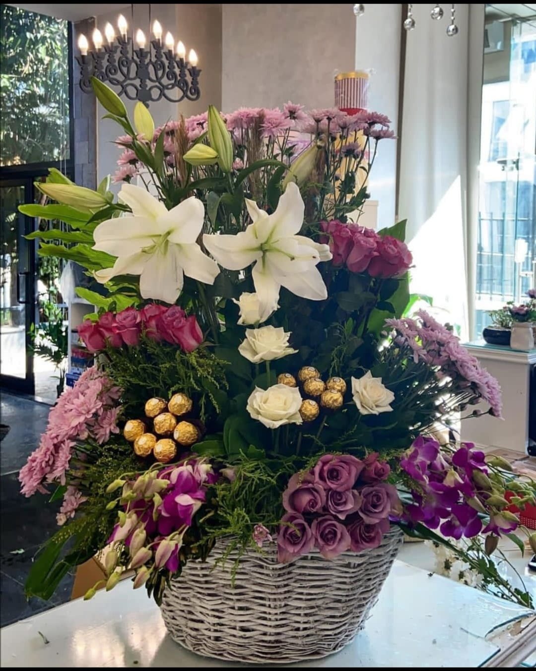 بوكيه استاند يحتوي على باقات رائعه من زهور الورد الجوري المستورد والليليم وشوكولا فرنسيه