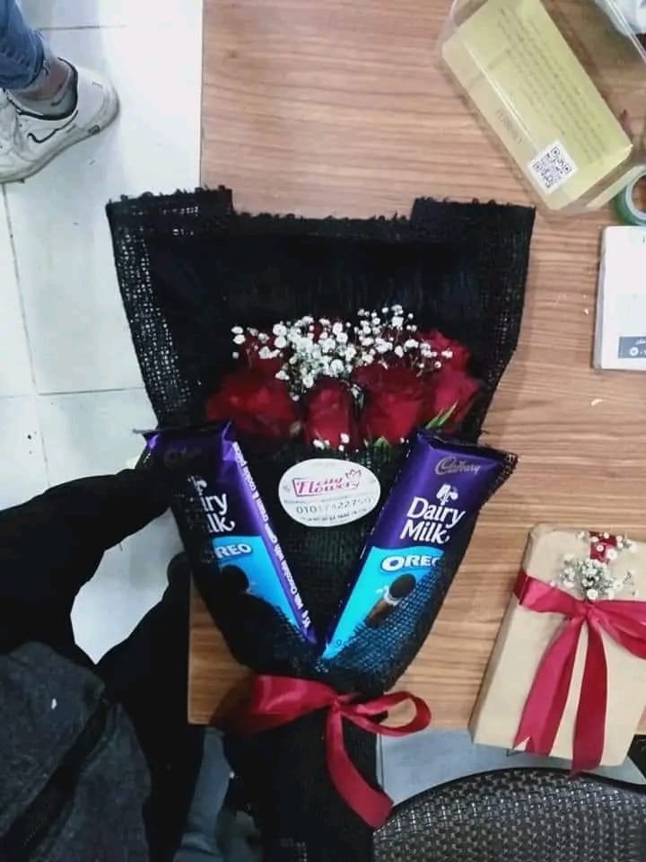 بوكيه هاند بجوري احمر وشوكولا وبيبي فلاور بلفه سودا وشريط احمر
