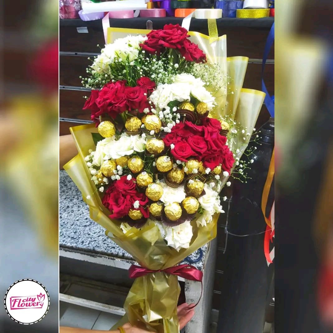 بوكيه هاند بجوري احمر وكرازنتم ابيض وشوكولا فرنسي فريرو روشي