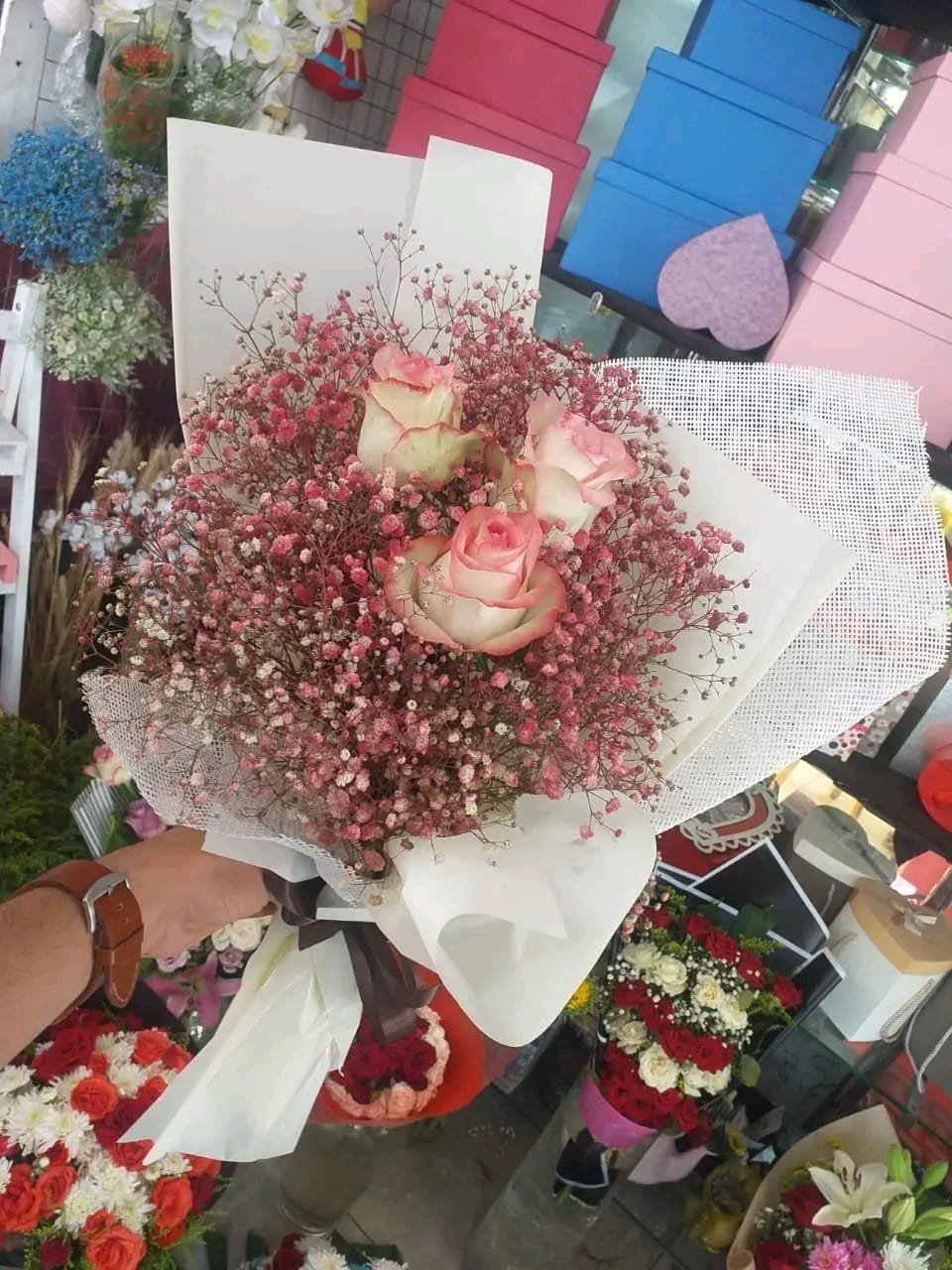 بوكيه هاند بجوري روز وبيبي فلاور روز بلفه بيضا