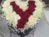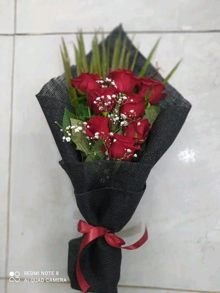 بوكيه هاند جوري احمر وبيبي فلاور ابيض بلفه سودا وشريطه حمرا
