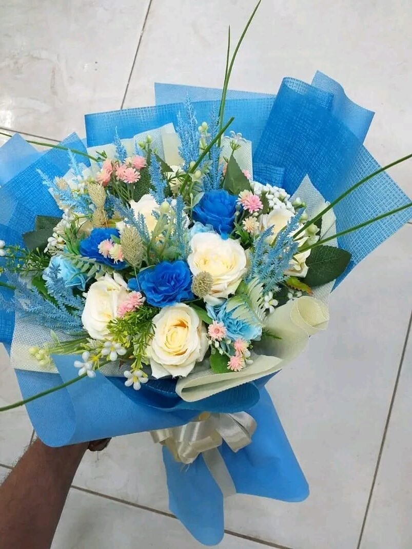 بوكيه هاند صناعي بورد جوري ابيض ازرق بلفه زرقاء