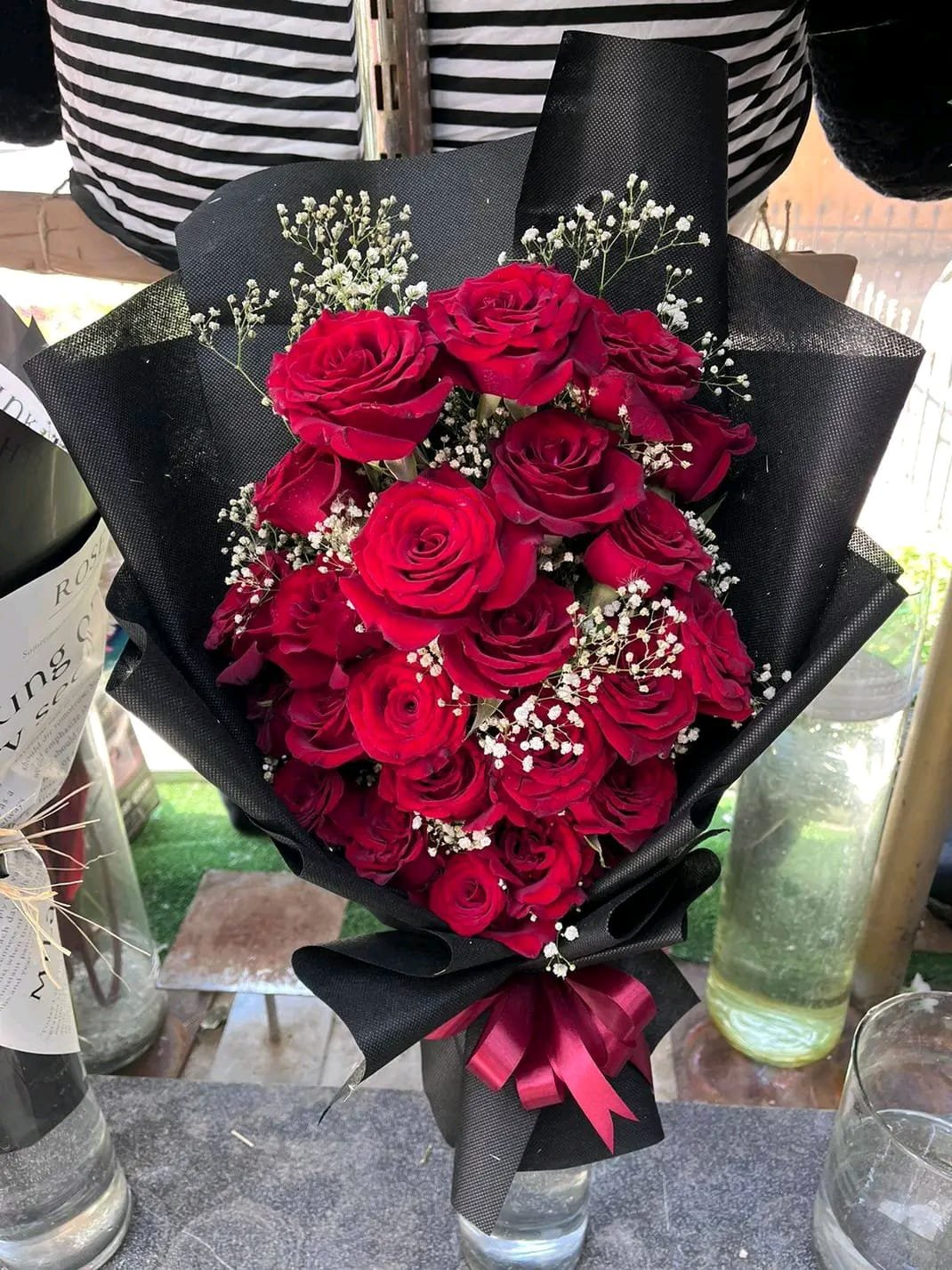 بوكيه هاند طبيعي بجوري احمر وبيبي فلاور ابيض بلفه سودا