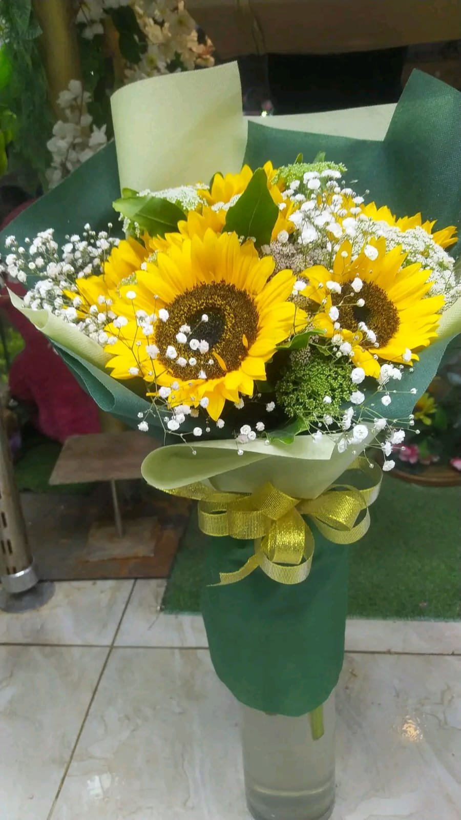 بوكيه هاند عباد شمس اصفر وبيبي فلاور ابيض