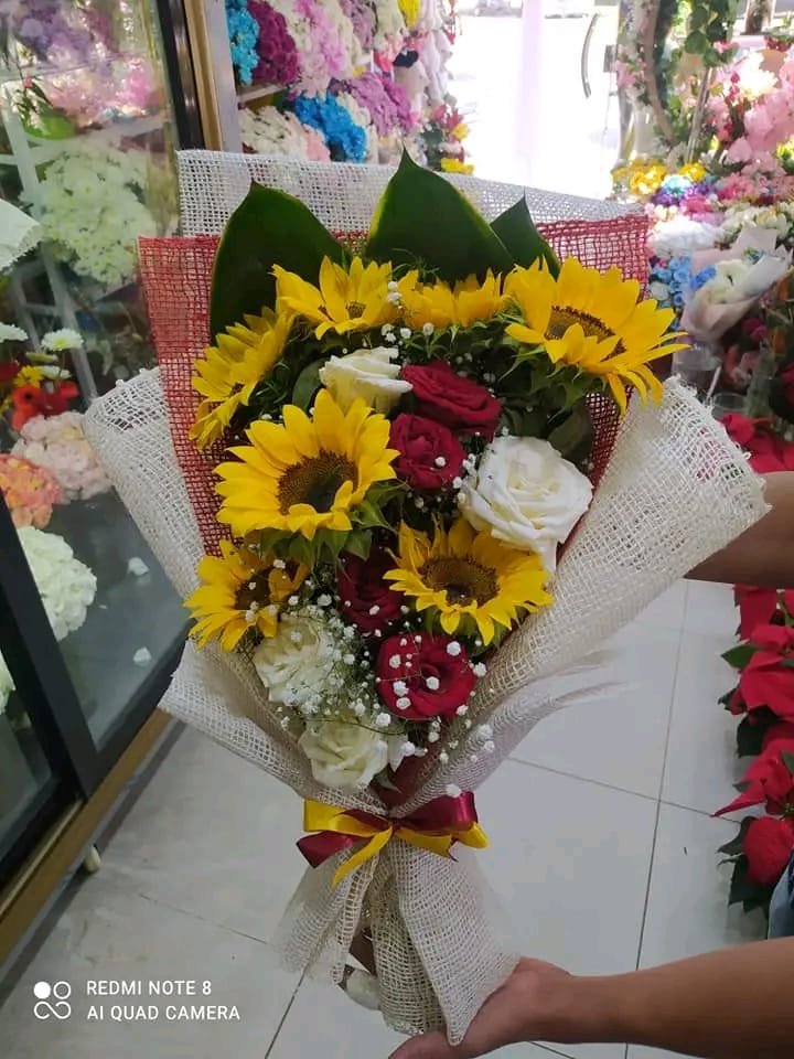 بوكيه هاند عباد شمس وجوري ابيض واحمر وبيبي فلاور