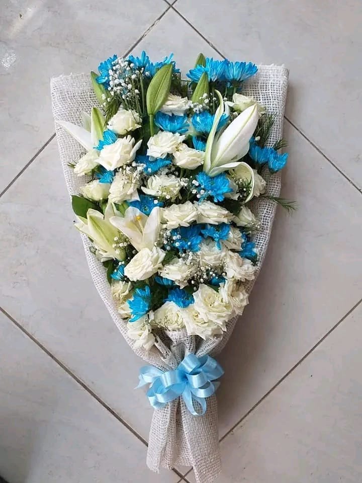 بوكيه هاند ليلم وجوري ابيض وكرازنتم ابيض وازرق