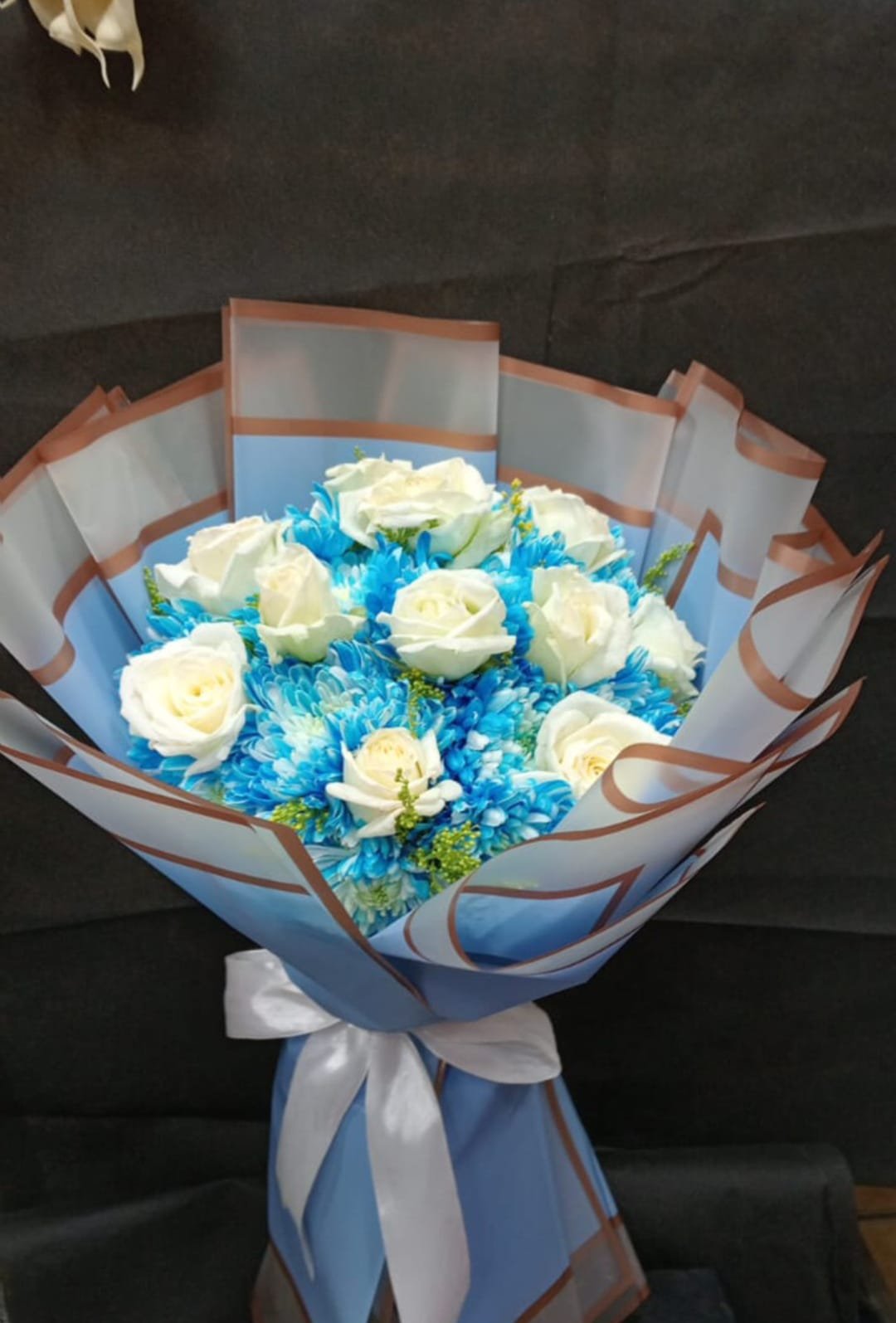 بوكيه هاند ورد ابيض وكرازنتم ازرق