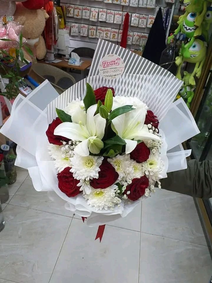 بوكيه هاند ورد جوري احمر وليليم ابيض وكرازنتم ابيض بلفه بيضا