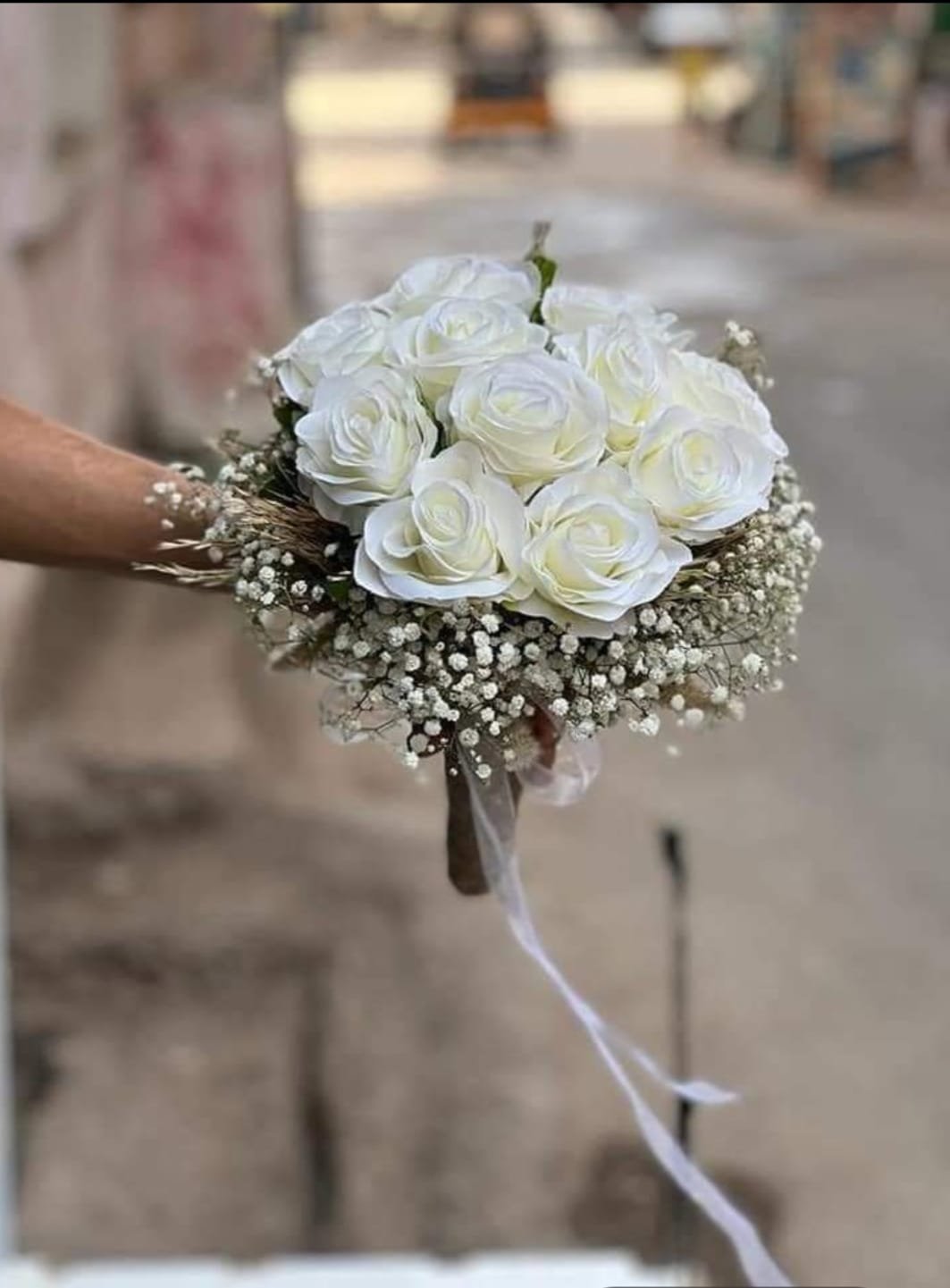 بوكيه عروسه بورد صناعي يحتوي على ورد ابيض صناعي وبيبي فلاور ابيض