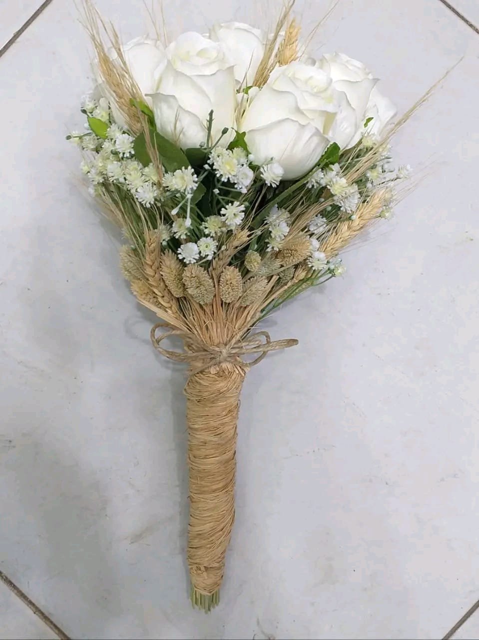 جرب صناعي ورد جوري ابيض وبيبي فلاور صناعي بهاند كتان بيج